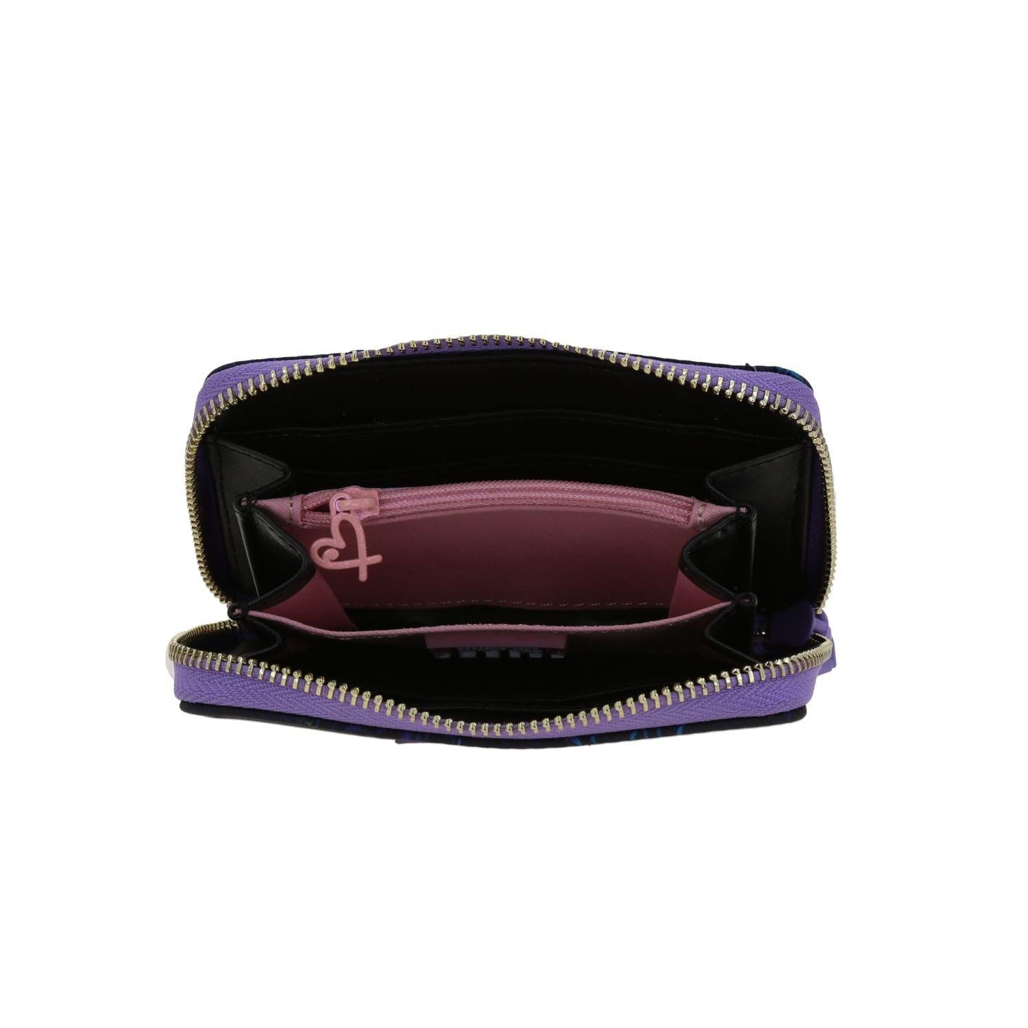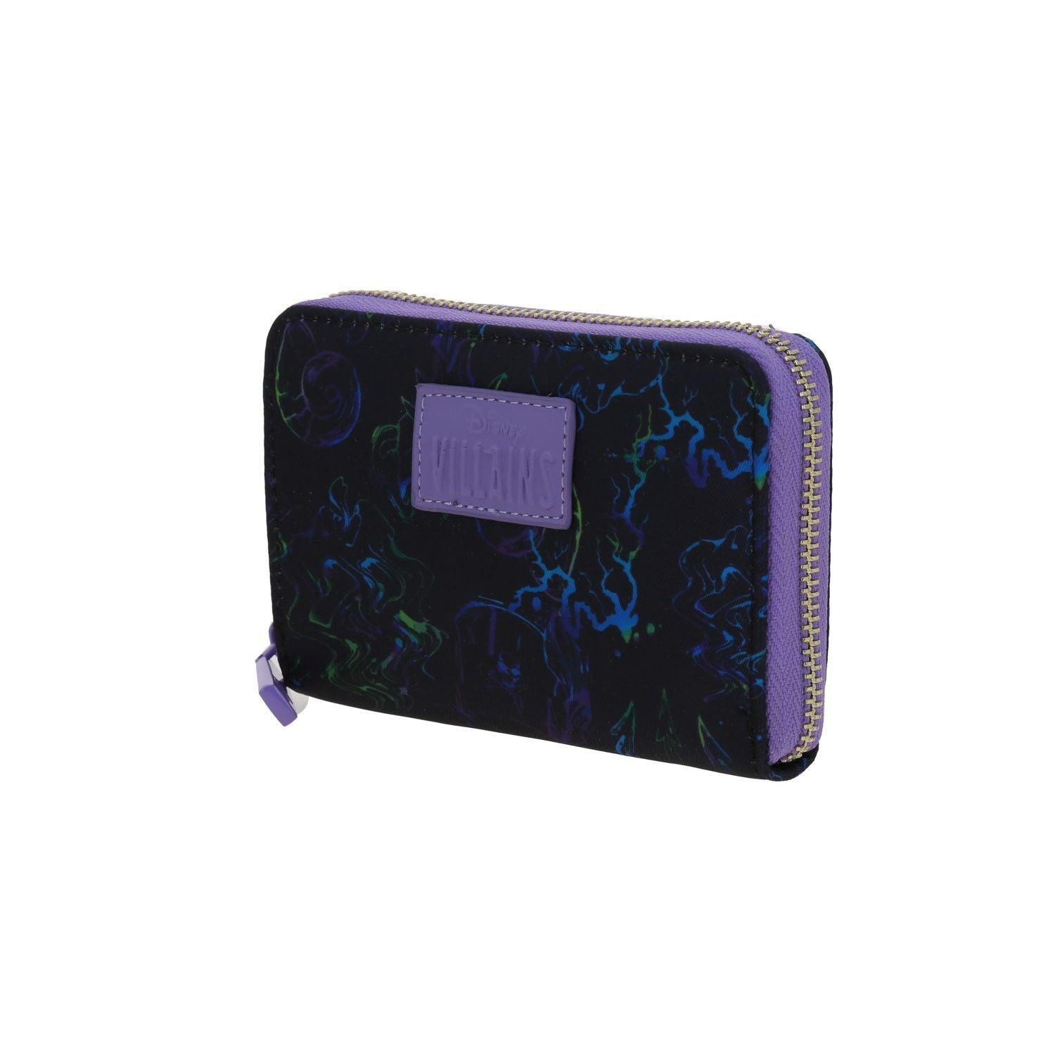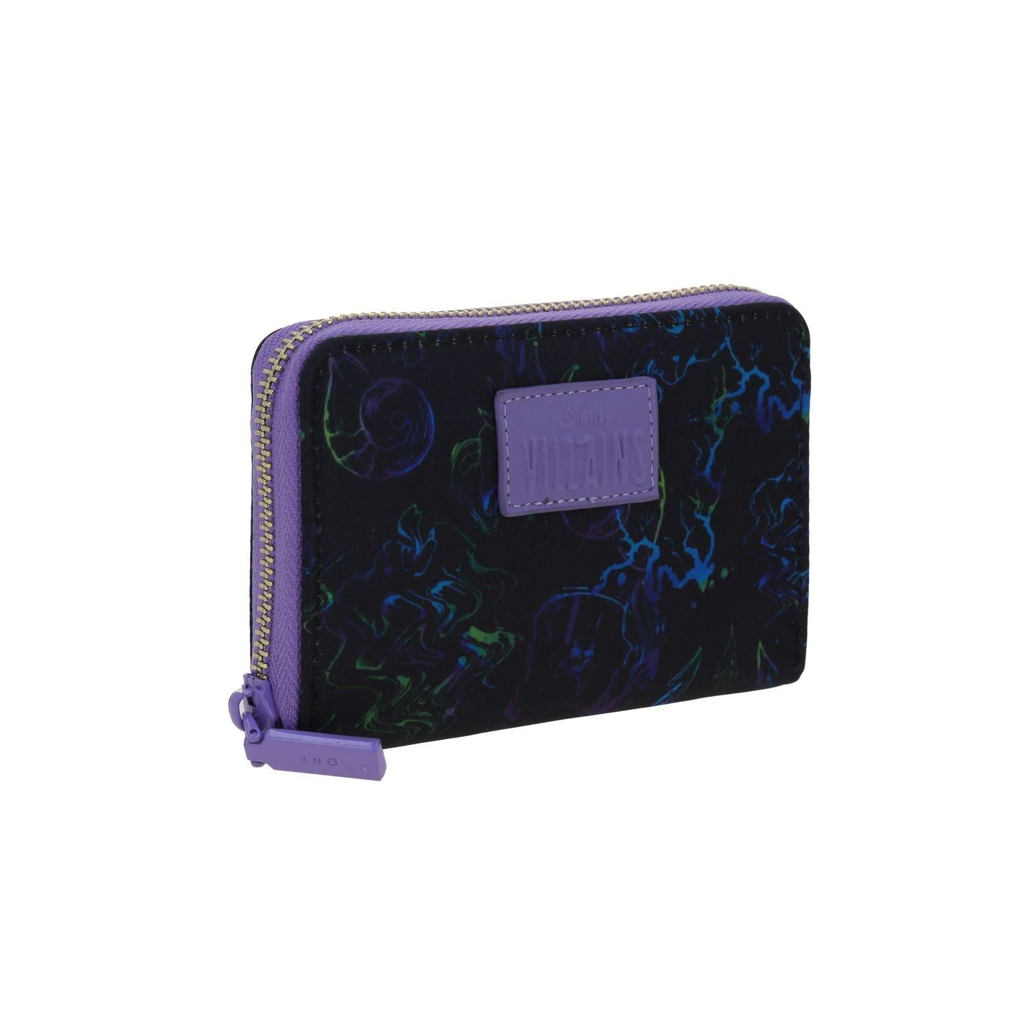 Cartera para mujer Villanas by Gorett en color negro inspirado en Ursula. Diseño sofisticado con textura lisa y detalles metálicos. Incluye compartimentos para tarjetas, billetes y cierre seguro. Un accesorio elegante y funcional que refleja poder y estilo.