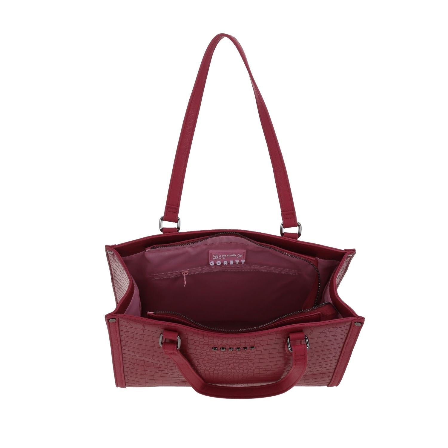 Tote para mujer Gorett Denneny en símil de piel con herrajes metálicos elegantes. Compartimento principal espacioso con cierre, múltiples bolsillos internos y bolsillo trasero con zipper. Asas largas y resistentes para comodidad. Diseño amplio, sofisticado y perfecto para el día a día con estilo.